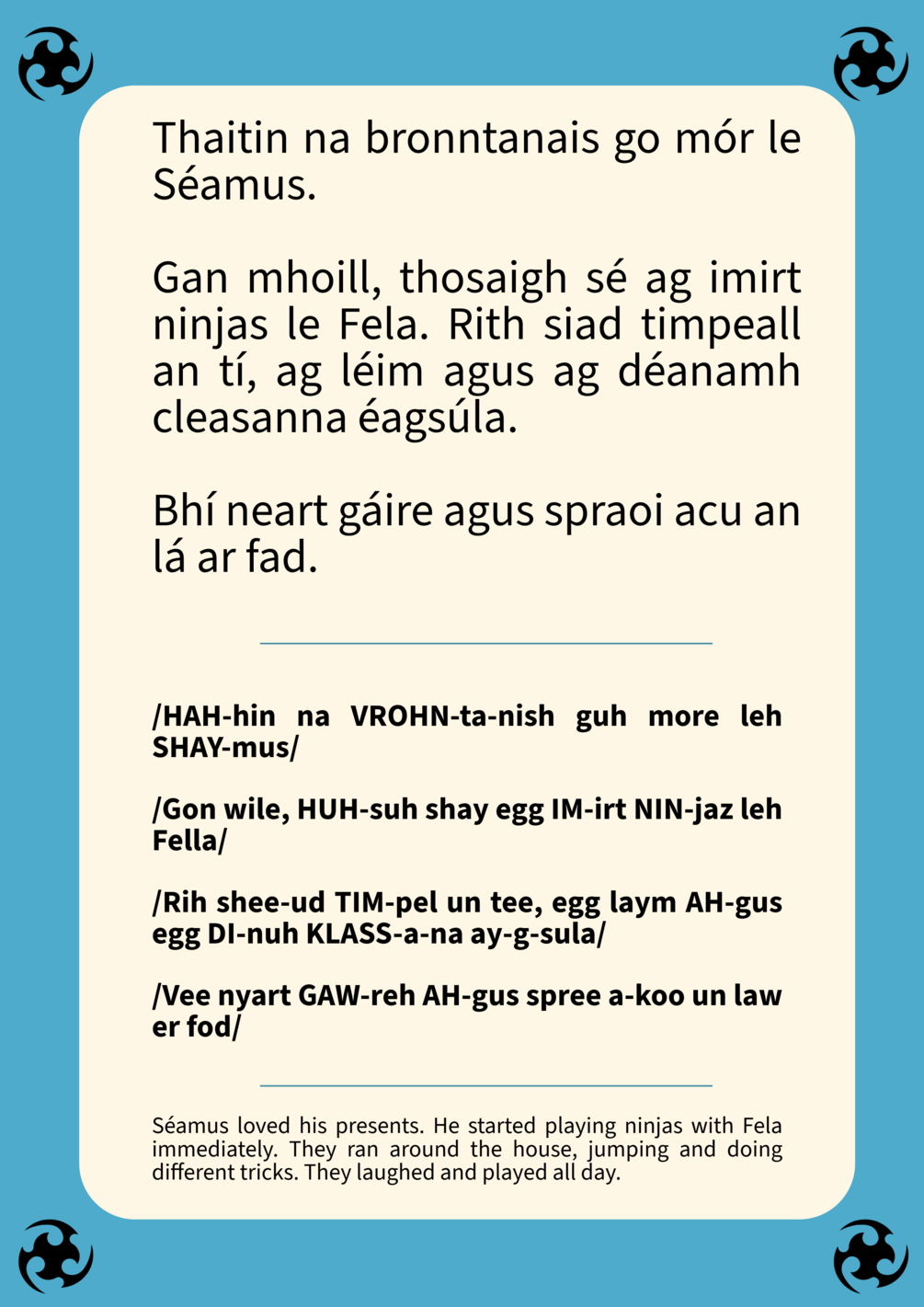 Celebrate a child’s dream of becoming a Ninja in this unique, printable, and fully customisable bilingual book. Each page includes Irish text, English translation, and simple phonetic pronunciation so children (and parents!) can read along with confidence. Fun black-and-white illustrations make every page perfect for colouring and even more personal.